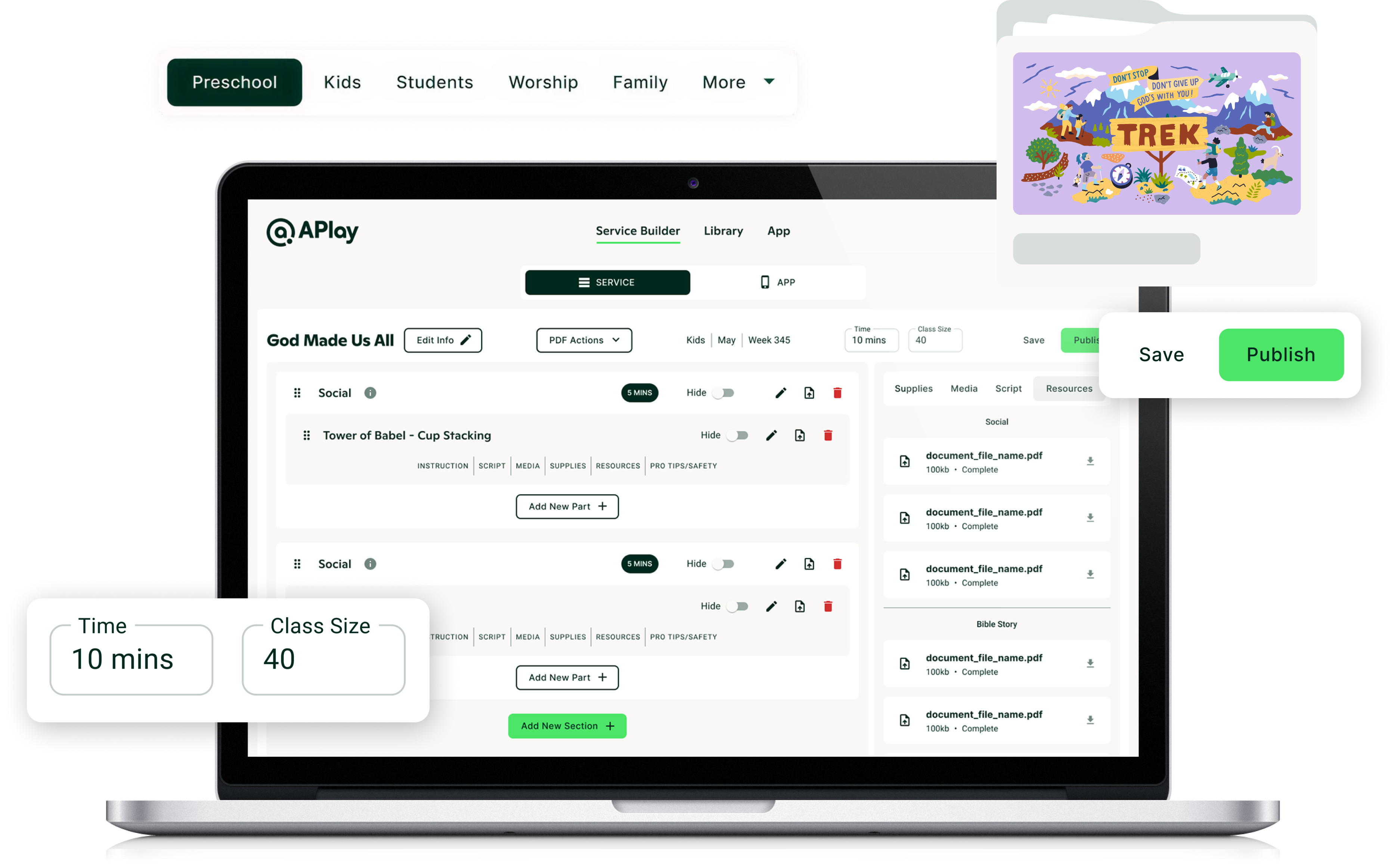 A powerful tool that gives ministry leaders the ability to organize and customize this week's content via highly responsive online workspace. Edit content, organize supplies, print activity pages and leader guides - all by child count.