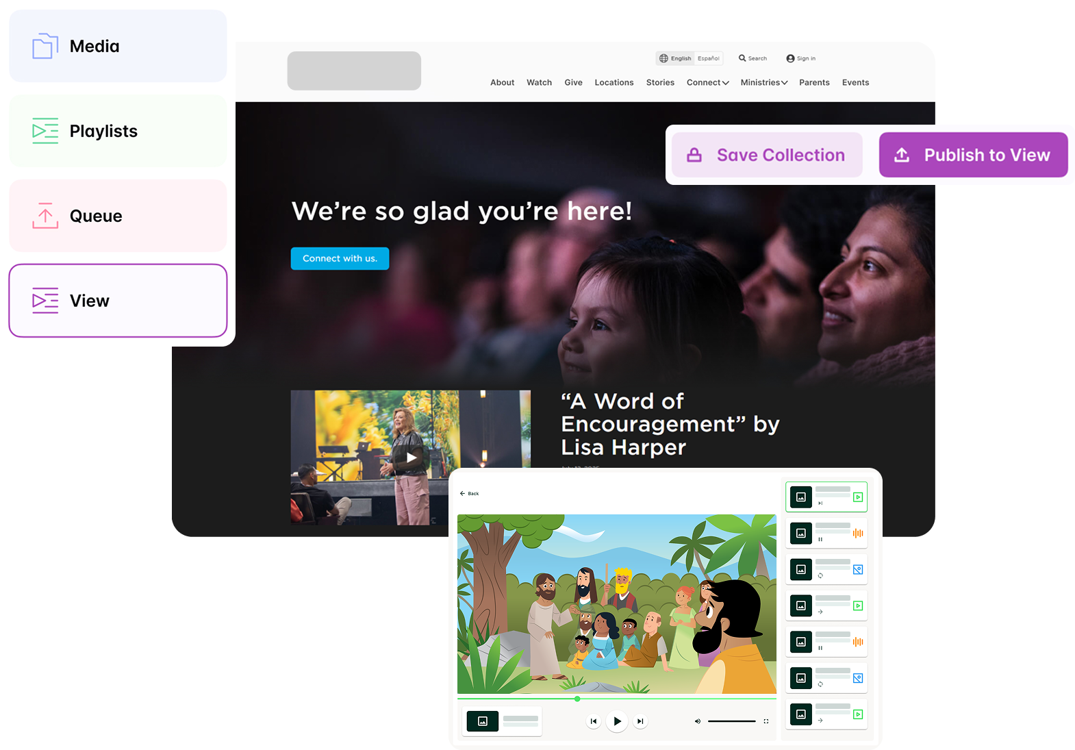 A web-based or AppleTV based media player that houses, organizes, schedules, and plays all your videos, graphics and mp3s, designed to streamline content delivery for churches. More ministry, less media management. Included in your curriculum subscription.